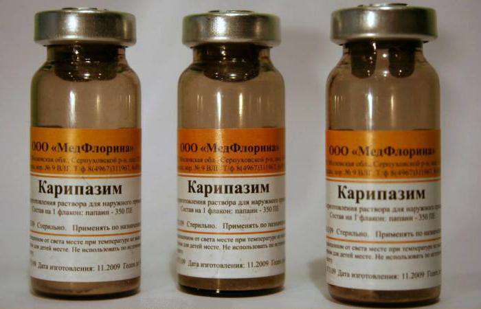 Виробляється витяжки з плодів екзотичного динного дерева, він має властивості цілого комплексу природних ферментів: протеолітичними, протизапальними і муколітичними. Електрофорез з «Карипазимом» при грижі, відгуки лікарів про якому можуть бути як позитивними, так і настороженими або суто негативними, прихильники розхвалюють за розм’якшення хрящових тканин хребців; за рубцювання травмованих волокон міжхребцевого диска і відновлення його амортизаційних властивостей завдяки підвищенню синтезу колагену; за протизапальну дію. В результаті, на їхню думку, зменшуються розміри грижі, звільняється нерв, знімається біль і запалення.