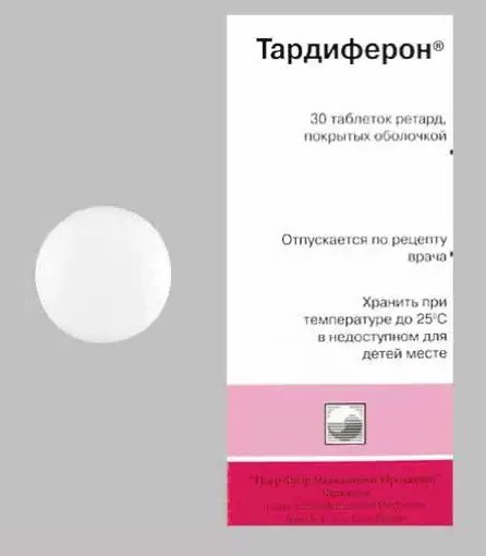Лікарський засіб «Тардиферон», інструкція якого вкладена в упаковку з картону, випускається у формі гладких і двояковыпуклых таблеток білого кольору, вкриті цукровою оболонкою.