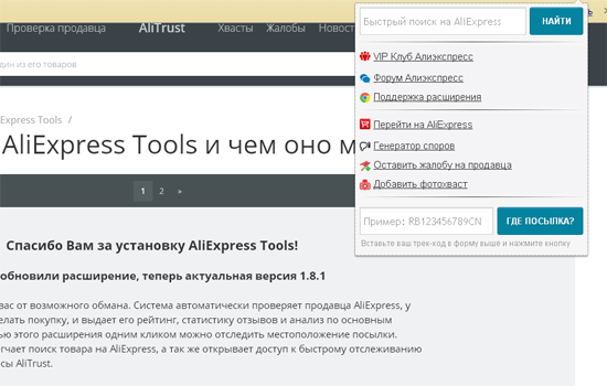 Не попастися на таку вудку дозволяє плагін AliExpressTools. Це розширення створила команда порталу http://alitrust.ru/, яка ставить перед собою завдання допомогти здійснювати на найбільшої китайської торгової майданчику «тільки вигідні і чесні покупки». Щоб її вирішити, творці AliExpressTools продумали безліч корисних речей для захищеності покупців, прискорення і зручності процесу придбання якісних товарів.