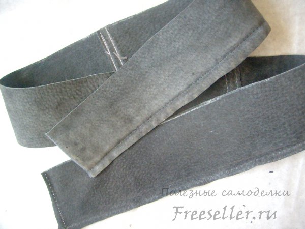За розміром ременя розраховуємо довжину і ширину замшевих смужок – так, щоб можна було повністю вшити в них наш каркас. Нарізаємо смужки. Зшиваємо їх в одну.