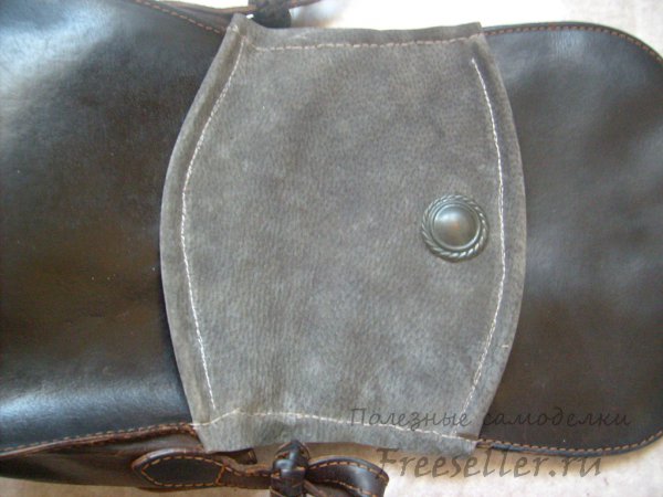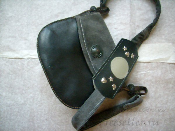 Повернути сумку до життя ми вирішили з допомогою замшевої накладки і нового ременя. Ще ми прикрасили її декоративної заклепкою і наременником (Гранжевый наременник своїми руками). Використовували шматок замші, старий поліуретановий поясний ремінь, дві пряжки-скоби для кріплення ременя, заклепку, пластиковий шнур, а також креслярські та швейні приналежності.