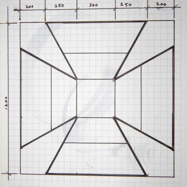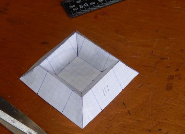 Це місце для багаття ідеально підійде для невеликих дворів. Щоб точно знати, як повинні складатися боку, необхідно вирізати маленький ескіз з картону. Ви можете побачити креслення на фотографіях.