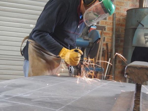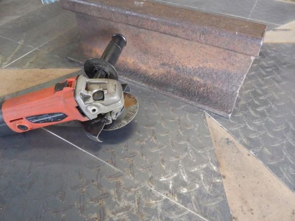 Накресліть відрізні лінії та лінії згинів на сталевому листі. Використовуйте болгарку, щоб відпиляти 4 кута.