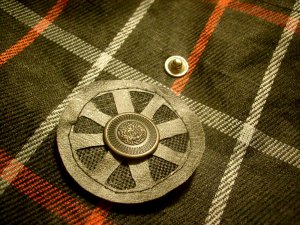 Дорожні та господарські сумки часто бувають складними. У складеному вигляді вони застібаються на кнопки для компактності. Ось ці-то кнопки і стануть кріпленнями для нашого нескладного декору, коли сумка розгорнута. Тобто, прикраси наші знімні. Ми виробляємо їх з обрізків дерматину двох видів – м’якого (сірого кольору) і щільного двошарового (на чорній тканинній основі). Нам знадобляться також розбірна кнопка відповідного розміру, нитки, креслярські та швейні приналежності.
