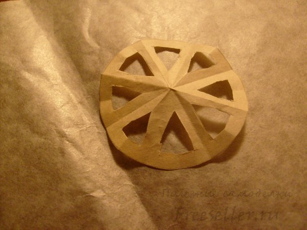 Згинаємо його в декілька складань і вирізаємо з нього подобу з дитинства всім знайомою паперової сніжинки.