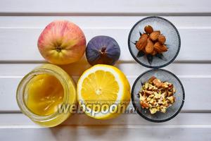 Інжир 1 шт.Лимон 0.4 шт.Мед – 2 ч. л.Мигдаль 20 гГоріхи волоські 3 шт.Яблуко 3 шт.