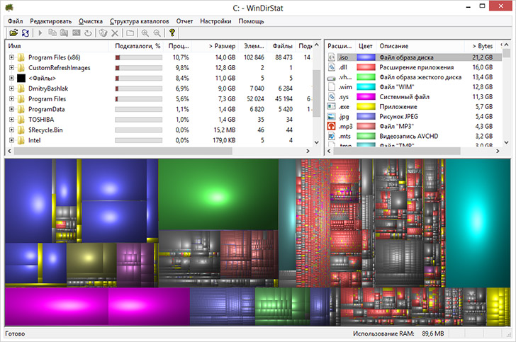 Після сканування жорсткого диска вашої системи, програма покаже, які типи файлів, які папки займають місце на диску. Дана інформація дозволить Вам більш точно визначити, що саме видалити, щоб очистити диск C. Якщо у вас зберігається безліч образів ISO, фільмів, які ви завантажили з торрента та інші речі, які в подальшому, швидше за все, не будуть використовуватися — сміливо видаляйте їх. Тримати на жорсткому диску колекцію фільмів на один терабайт зазвичай нікому не потрібно. Крім цього, в WinDirStat ви можете більш точно побачити, яка програма скільки місця займає на жорсткому диску. Це не єдина програма для цих цілей, інші варіанти див. у статті Як дізнатися, чим зайняте місце на диску.