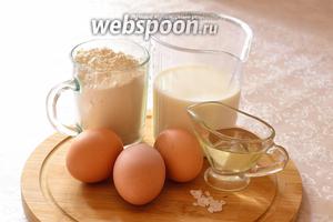 Молоко 280 млБорошно пшеничне 1 ст.Сіль 0.25 ч. л.Яйця курячі 3 шт.