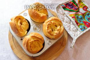Дістаємо форми і швидко розливаємо тісто, заповнюючи кожну форму не більш ніж наполовину. Ставимо в розігріту духовку на 15-20 (залежить від духовки) хвилин, при температурі 220°С. Під час приготування дверцята духовки не відкривати. Готовність визначаємо по тому, як добре піднялися булочки і за їх золотистого кольору.