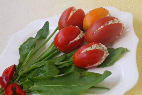 Подати закуску «Тюльпани» з помідорів до святкового столу.
