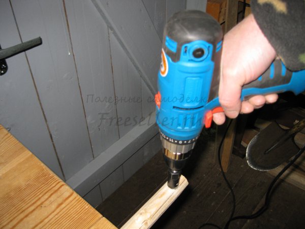 На одному кінці цієї рукоятки, просвердлив отвір кільцевої пилкою по дереву. Це отвір потрібно для того, щоб можна було вішати на граблі гвоздик або гачок.