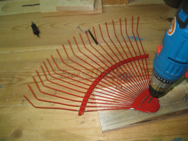 Потім просвердлив у зламаних віялові граблі (на підставі і в середині верхньої перемички) два отвори свердлом діаметром 4 мм.