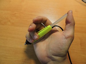 Єдине, що хочеться віднести до мінусів даної саморобки так це нагрівання нижній частині корпусу, хоч пластик і товстий, але все одно відбувається відчутний нагрів, який передається в руку. Я вирішую цю проблему просто – чекаю, поки нагріється жало, а потім відключаю його від мережі, і користуюся, поки не охолоне (це близько 5 хвилин) чого для мене досить. Можна доопрацювати нижню частину по своєму: обмотати ізолентою в декілька шарів, або чим іншим, загалом, способів багато. Для мене головне було, щоб відбувалася подача клею, і не плавився пластик конструкції, що на досвіді і було досягнуто.
