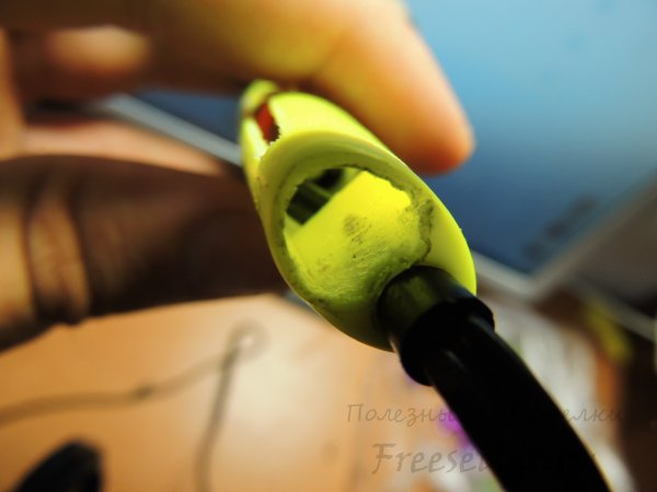 Нижню частину засовуємо в корпус, натягуємо провід і вставляємо в отвір більш товстий шматок.