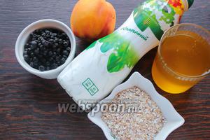 Для «смугастого» смузі, треба йогурт, чорниця, персик, мед, пластівці (швидкого приготування).