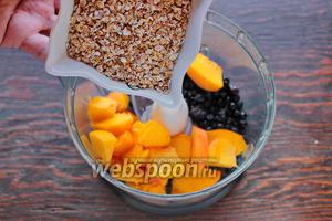 Змішуємо в чаші блендера, чорницю, очищений персик і пластівці. Збиваємо в режимі «пульс».