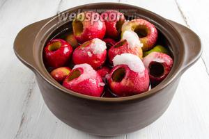 Підготовлені яблука викласти в зручну посуд. Засипати цукром. Закрити кришкою і залишити в кімнаті. Яблука повинні пустити сік.