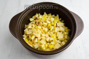 Айву вимити. Зрізати жорстку серцевину. Нарізати дрібним кубиком. Викласти в підготовлену айву в антипригарну посуд.