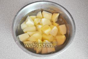 Очистити картоплю і порізати на кубики середньої величини. Добре промити його від зайвого крохмалю і залити холодною водою.