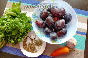 Для Ткемалі нам знадобиться сливи, часник, перчик чилі, пучок свіжої петрушки, селери, кінзи, суха м’ята, гвоздика, зіра, коріандр. Сіль і цукор за смаком.