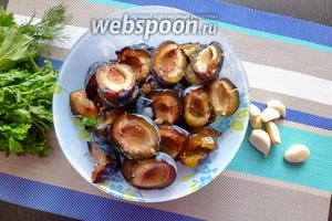Сливи моєму і витягуємо з них кісточку. Часник чистимо.