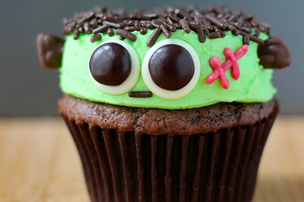 Знову монстрик, але на цей раз щільний крем для мафінів/кексів покладений зверху не класичними завитками, і не «шапкою», а за допомогою малої кулінарної лопатки високим «колесом», що одночасно є головою зомбі або чудовиська Франкенштейна. Майже всі інші деталі виконуємо з мастики, а у якості волосся використовуємо декоративну посипання у вигляді паличок коричневого кольору – для тістечок і тортів. За необхідності для кріплення деталей використовуємо харчової клей.
