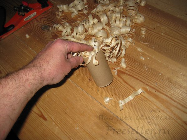 При цьому, оскільки стружки самі по собі не дуже зручно використовувати, так як вони постійно розсипаються, або розлітаються від вітру, мені прийшла ідея застосовувати для розпалювання багаття саморобні контейнери з картонних втулок набиті стружкою. Причому краще всього для цієї мети підходять втулки від рулонів туалетного паперу.