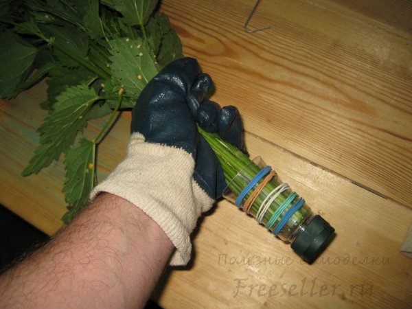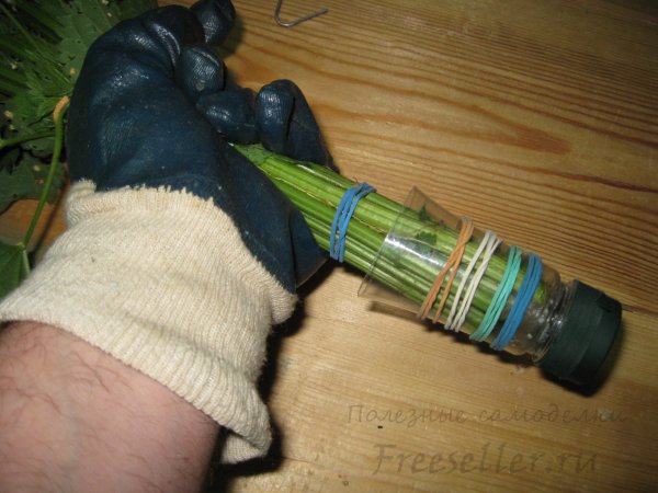 Беремо заготовлений кропив’яний віник і одягаємо нашу оправку на пучок стебел. При цьому сам віник тримаємо рукою, на яку одягнена гумова рукавичка, щоб не окрапивиться.