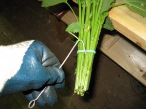 Виявилося, що цей спосіб дійсно простий і досить зручний. Однак практика виявила і один недолік даного способу. Виявилося, що дуже незручно складати гумку в три кільця і одягати її на кропив’яні стебла в товстих гумових рукавичках. Тим не менш, без рукавичок цю операцію робити неможливо, оскільки можна окрапивить всі руки.