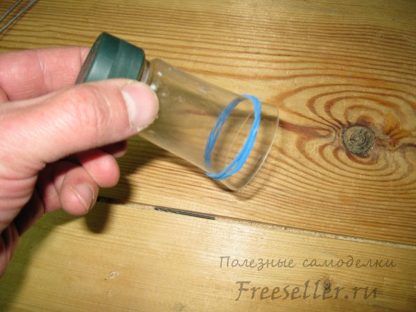 Таку оправлення я виготовив з невеликої пластикової пляшки з-під часникового соусу, відрізавши від неї частину горлечка з пробкою, для чого мені потрібні ножиці, канцелярський ніж і наждачний папір.