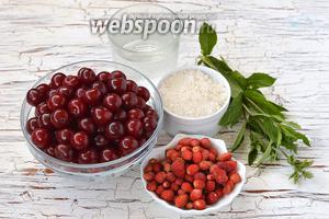 Вишня свіжа 350 гВода 2 лСуниця 0.5 ст.М’ята свіжа 3 гілочкаЦукор 200 г