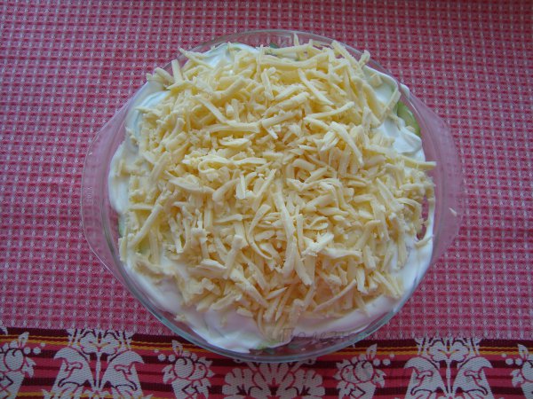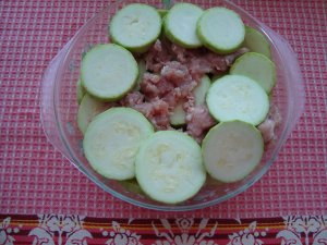 Повторіть аналогічні шари з овоча і фаршу. Не треба притискати нарізку і не намагайтеся їх щільно поєднувати. При гасінні в мікрохвильовки кабачки розм’якшують і страва прийме іншу форму.
