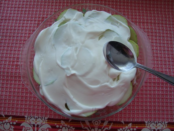 Поверх останнього шару з кілець нанесіть сметану тонким шаром.