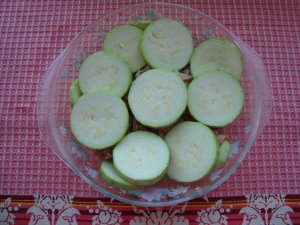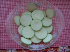 Кабачки необхідно очистити від шкірки і нарізати кільцями, ширина яких ближче до 0,5 см.