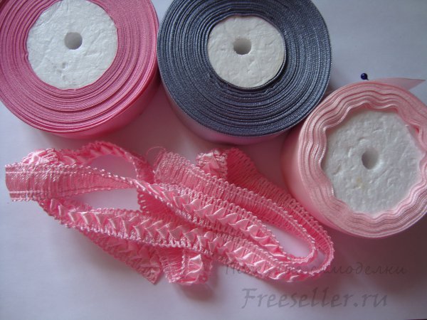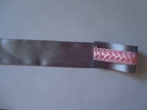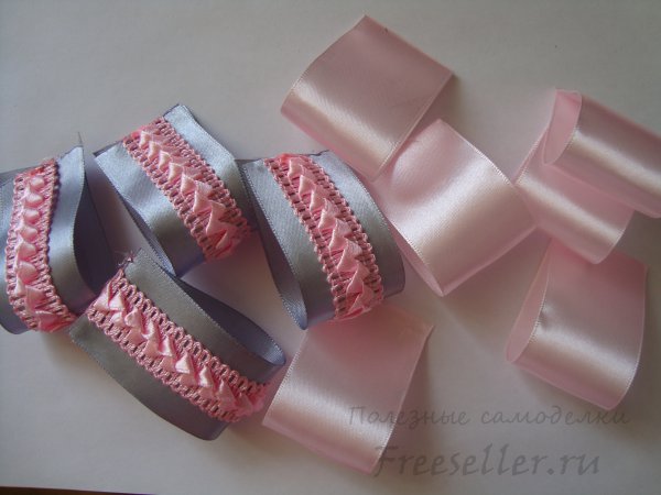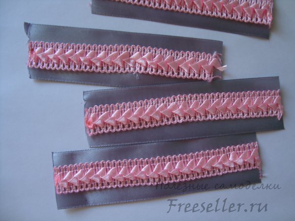 По центру сірої стрічки закріпіть рожеву стрічку. Для цього оплавьте краю стрічок, і поки атлас не встиг засохнути, миттєво притисніть деталі і вони спаяются.