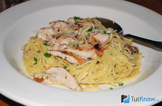 Це блюдо, строго кажучи, не можна зарахувати до класичної національної італійської кухні, оскільки, спагетті карбонара, використання курки не передбачає. Так і вершки теж не додаються, оскільки вони роблять страву значно жирніше. У класичному рецепті знаходяться тільки: бекон, яйця, сир і, природно, самі спагетті. Але ж не дарма кажуть: «якщо не можна, але дуже хочеться — значить можна». Саме так і з цим рецептом. І чому б не приготувати кулінарний шедевр — пасту карбонара з куркою?