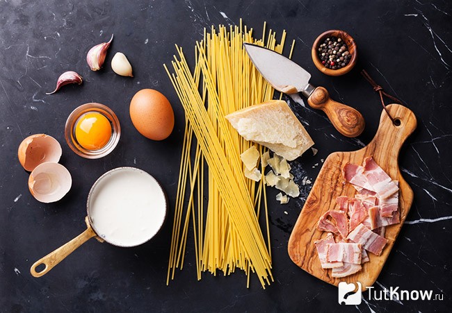 - По-перше, має бути певна кількість яєць. Оскільки вони становлять основу соковитого соусу і склеюють всі інгредієнти з тонкими спагетті. Доводяться до потрібної готовності яйця тільки від жару і тепла зварених макаронів. Саме тому важливо визначити, кількість потрібних яєць для певного обсягу спагетті. В основному, на 400 г спагеті йде 3 шт. яєць.