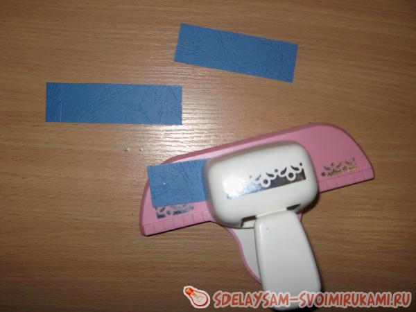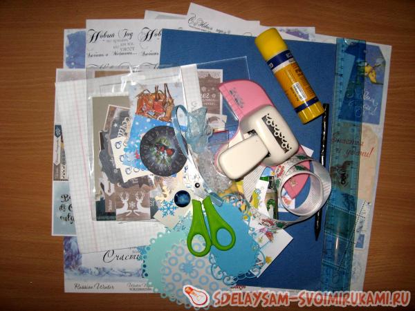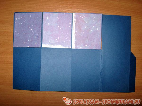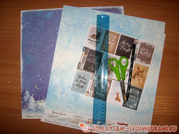 Тепер беремо скрапбумагу і вирізаємо заготівлі таких розмірів: з темно-синього паперу вирізаємо по три прямокутника 6,7*8,2 см і 6,7*9,8 см, а також два великих 6,7*18,3 см, блакитного паперу вирізаємо три прямокутника 6,7*8,2 див.