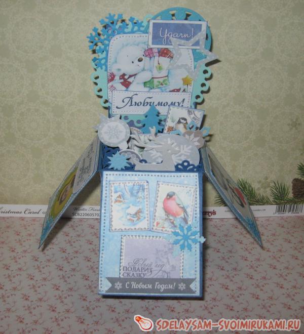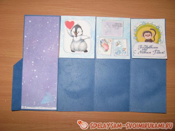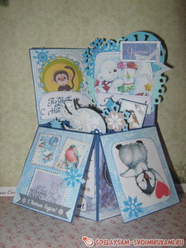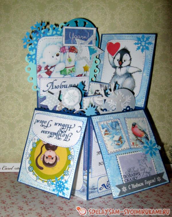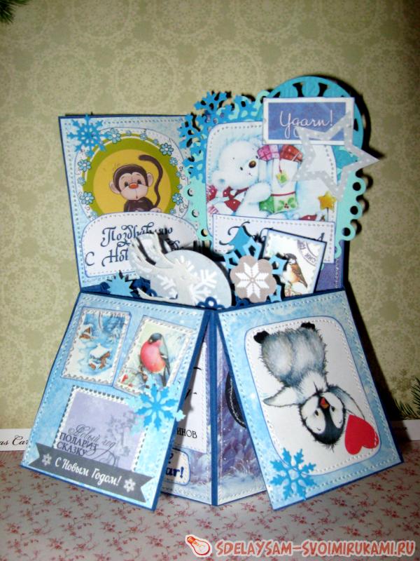 Вже, мабуть, всім добре відомо, що 2016 рік буде Роком Мавпи за східним календарем. Тому всі подарунки, із зображенням цього забавного й смішного звіра. Це може бути брелок, скарбничка, статуетка, кулька, пакет, листівка, мило та інше. Все, що пов’язано з мавпочкою вже, як-то асоціюється з веселощами і удачею, тому потрібно в цей Новий Рік обов’язково порадувати своїх близьких. Що ж за свято без душевних і святкових привітань? Це вважайте, що нічого, тому обов’язково потрібні листівки, які можна підписати, а ще краще зробити своїми руками. Це і буде як би подарунок 2 в 1. І цікавий сюрприз, і новорічні побажання. А об’ємні листівки ще й цікавою розкладний форми взагалі будуть виглядати, як справжнє диво, на яке людина потрапляє, дивлячись на неї. Що ж такого цікавого в такій листівці. Об’ємна листівка являє собою розкладну листівку, яка також набуває форму коробку і на ній присутні різні повітряні елементи зимового декору і новорічні аксесуари.