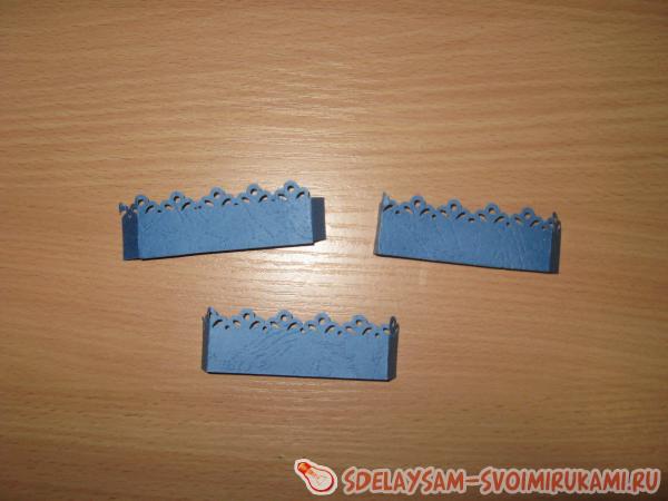 Тепер за схемою робимо зрізи і лінії біговки. Із смужки картону, який залишився, вирізаємо три перегородки для об’ємних деталей. Розмір перегородок 1*7*1 см, всього їх три.