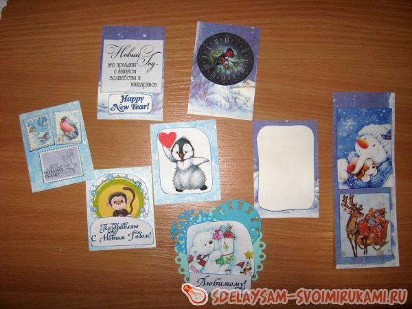 Різні новорічні висічки та ярлики у вигляді квадратиків, цікавих вирізок з написами, марок з побажаннями;