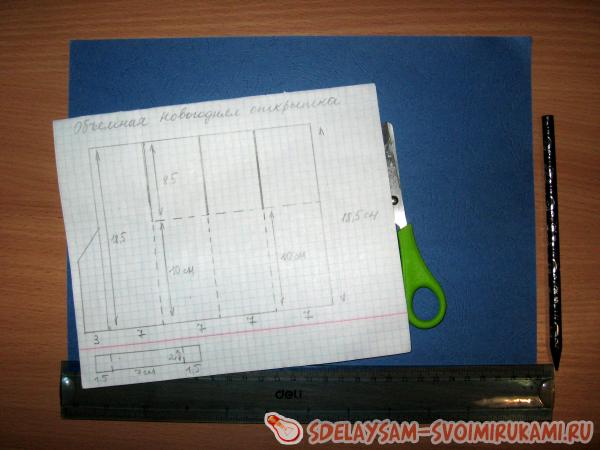 Кладемо перед собою схему і вивчаємо її. Шаблон досить зрозумілий, для початку вирізаємо з темно-синього картону прямокутник 18,5*31 див.