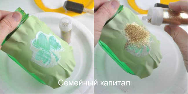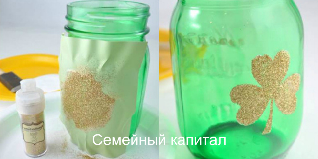 У другій банки, навпаки трафарет залишений матовим, а блискітками розписана вся банку. Щоб зробити так, вирізати малюнок. Акуратно приклеїти його на банку. Можна скористатися милом. Нанести на банку шар клею ПВА і посипати блискітками.