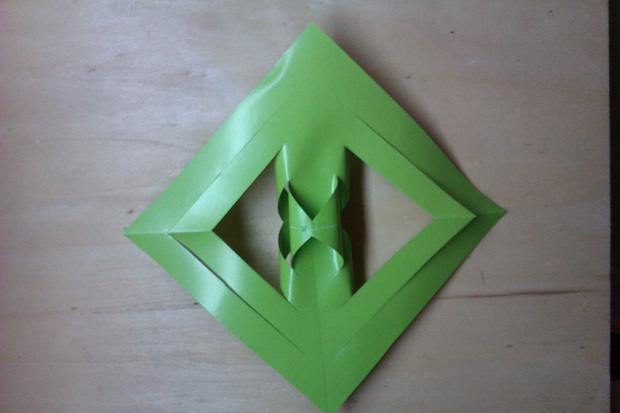 5. Перевертаємо квадратик і починаємо робити серединку променя. Для цього ложем заготівлю ромбом і кути маленького трикутника склеюємо. Буде трохи незручно, так як зазор простору маленький. Можна обережно підсунути ножиці і притиснути.