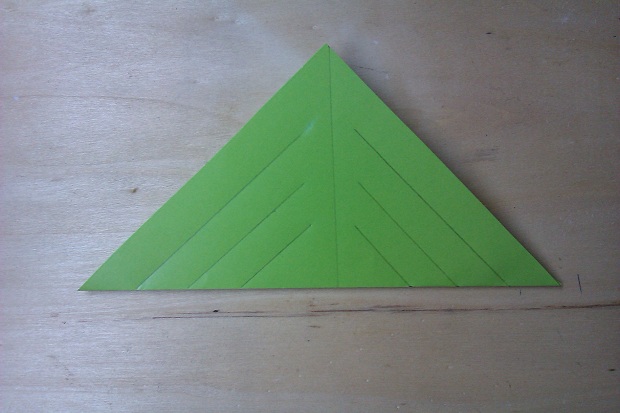 2. Потім згинаємо квадрат по діагоналі і по центру трикутника проводимо ледве помітну лінію. Це буде для орієнтира.