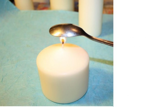 3. Нагріти внутрішню сторону чайної ложечки над вогнем свічки, швидко перевернувши її, почати розрівнювати фрагменти серветки, або всю її поверхню. Віск починає плавитися і папір пристає до заготівлі. Простежте, щоб не було бульбашок повітря, все добре розрівнюючи.