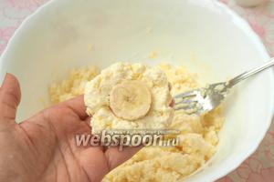 Вологими руками набрати частину сирної маси, сформувати сирник. У центр покласти гурток банана і прикрити його сирною масою.