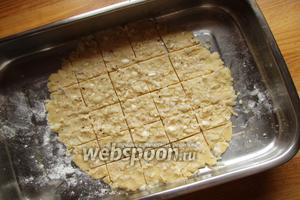 Ну і в самому кінці розподіляємо поверху цибульну начинку, вдавлюючи її в тісто. І розрізаємо наш пісочний пласт на квадратики. Відправляємо в духовку на 180 градусів на 30-35 хвилин. Випікаємо до золотистого кольору і цибульного аромату.
