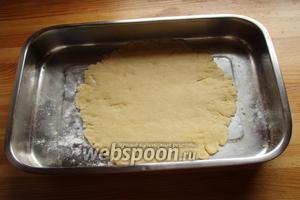 Наше розподіляємо тісто руками і за допомогою качалки на присипаний борошном деко. Розкочуємо тонко на 3-5 мл.
