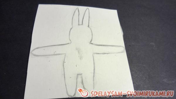6.На аркуші білого картону малюємо шаблон зайця. Зверніть увагу, довжина лап зайця повинна бути достатньої довжини, щоб її вистачило для кріплення на цукерці.